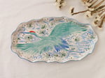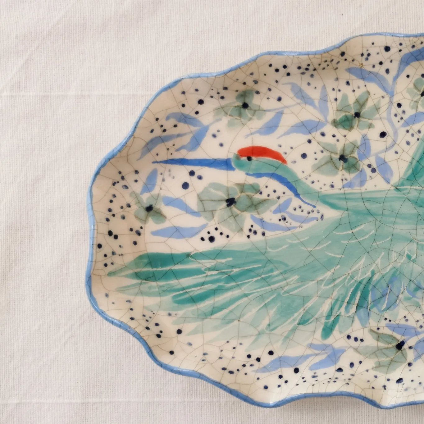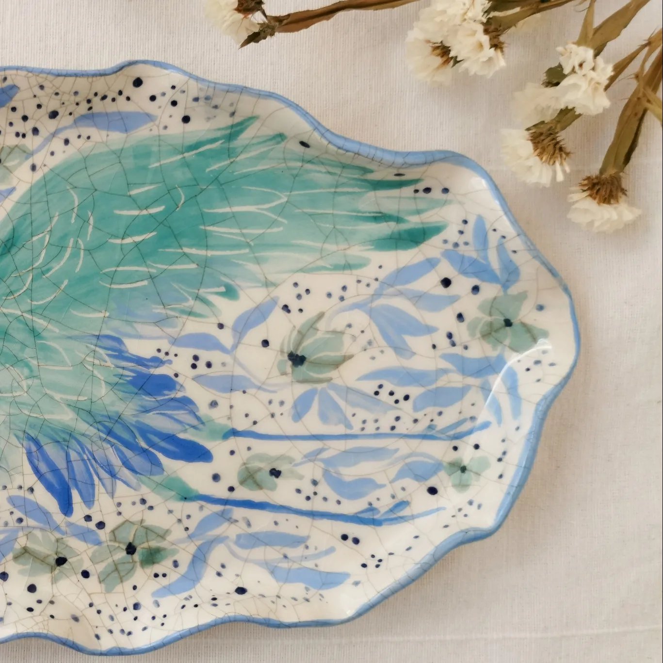 Bandeja de cerámica hecha con pasta de semigres, modelada a mano y pintada a mano alzada. Se han utilizado diferentes técnicas con óxidos y esgrafiado. Colores azul claro, verde menta, azul cobalto y rojo. Esmalte craquelado. Uso decorativo.