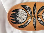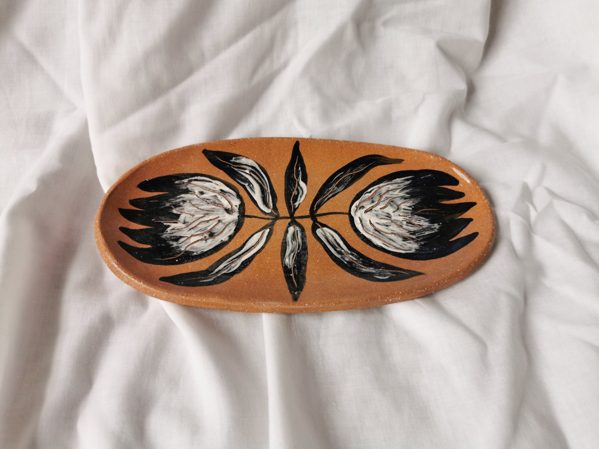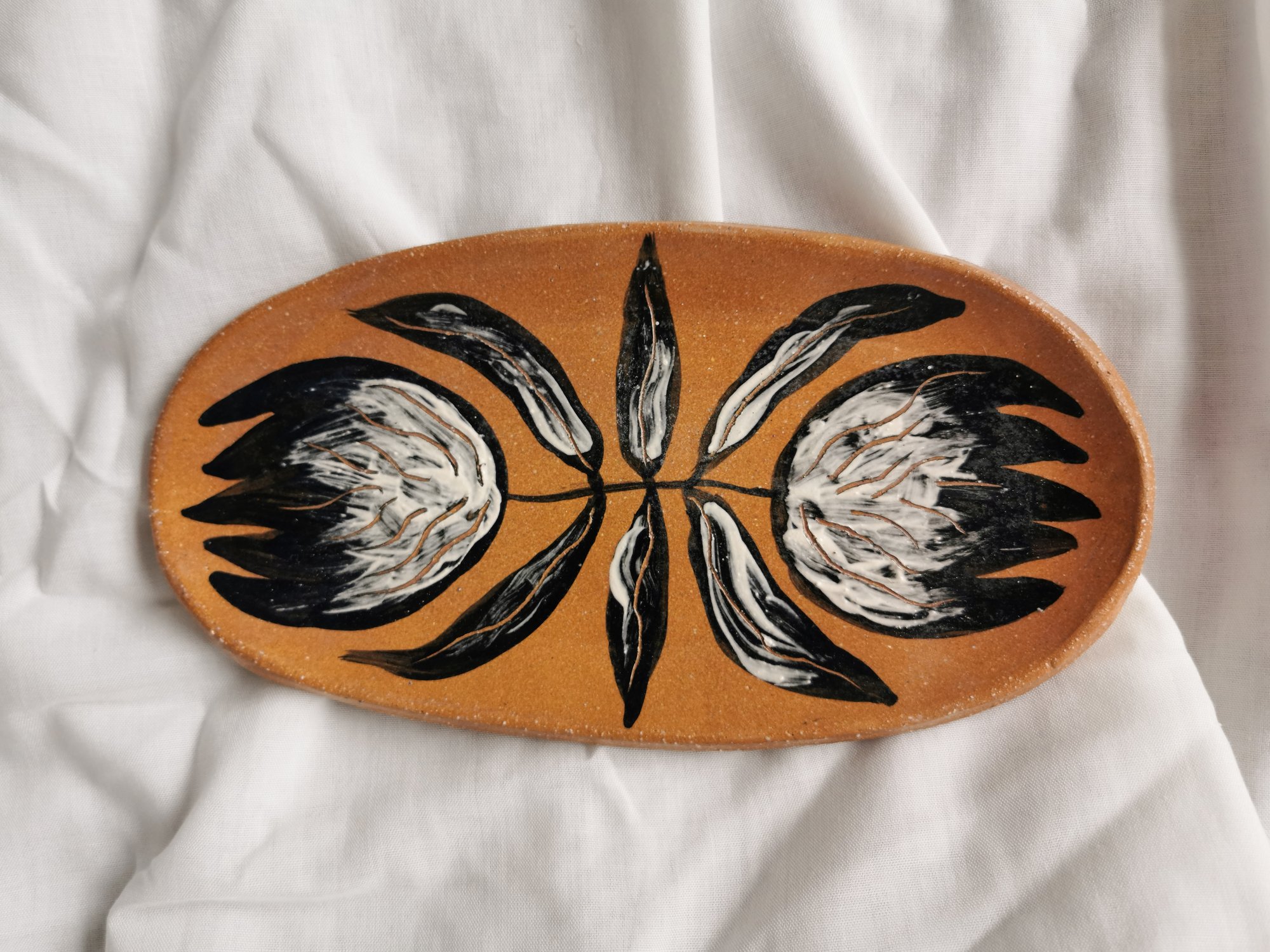 Bandejita de cerámica, pasta roja con chamota fina, modelada y pintada a mano con Engobes negro y blanco, esgrafiado. Esmalte transparente sin plomo. Uso decorativo o doméstico.