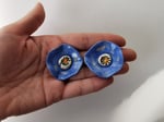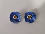 Pendientes de cerámica de loza, modelado a mano y pintados a mano, con pigmentos azul, negro y naranja.