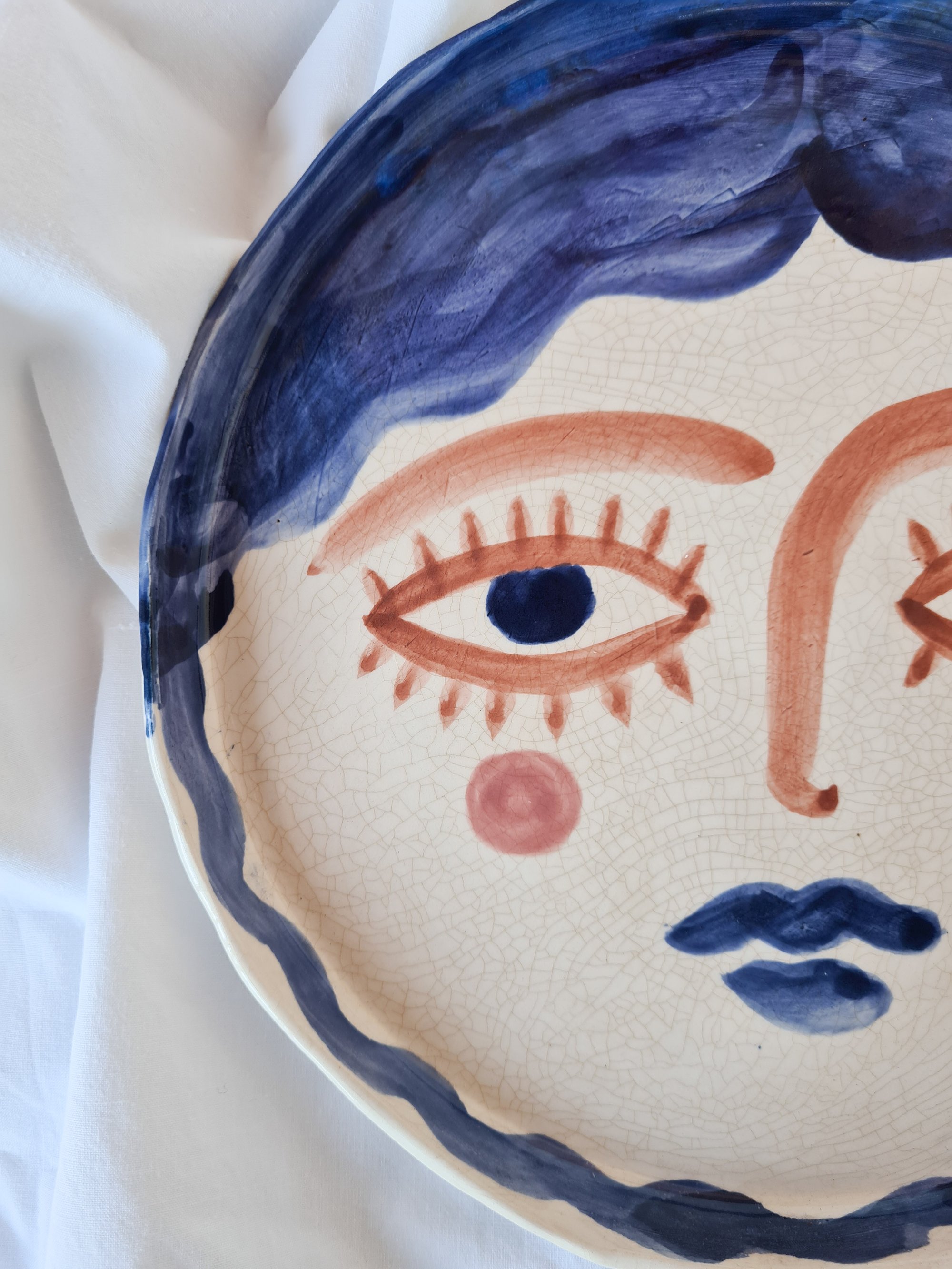 Plato de cerámica hecho y pintado a mano, pieza única, esmaltado con craquelé. Colores azul cobalto, caramelo y rosado melocotón.