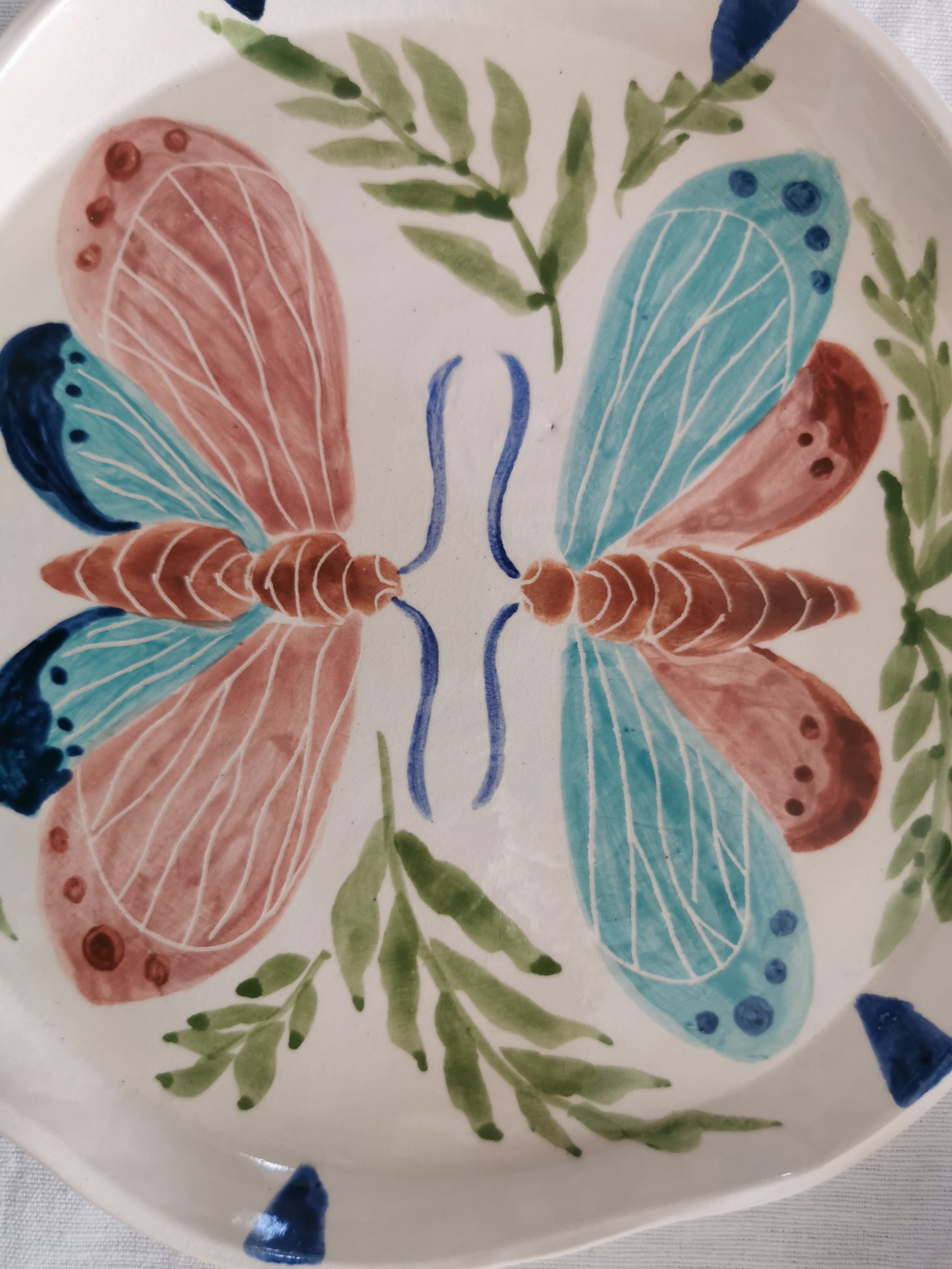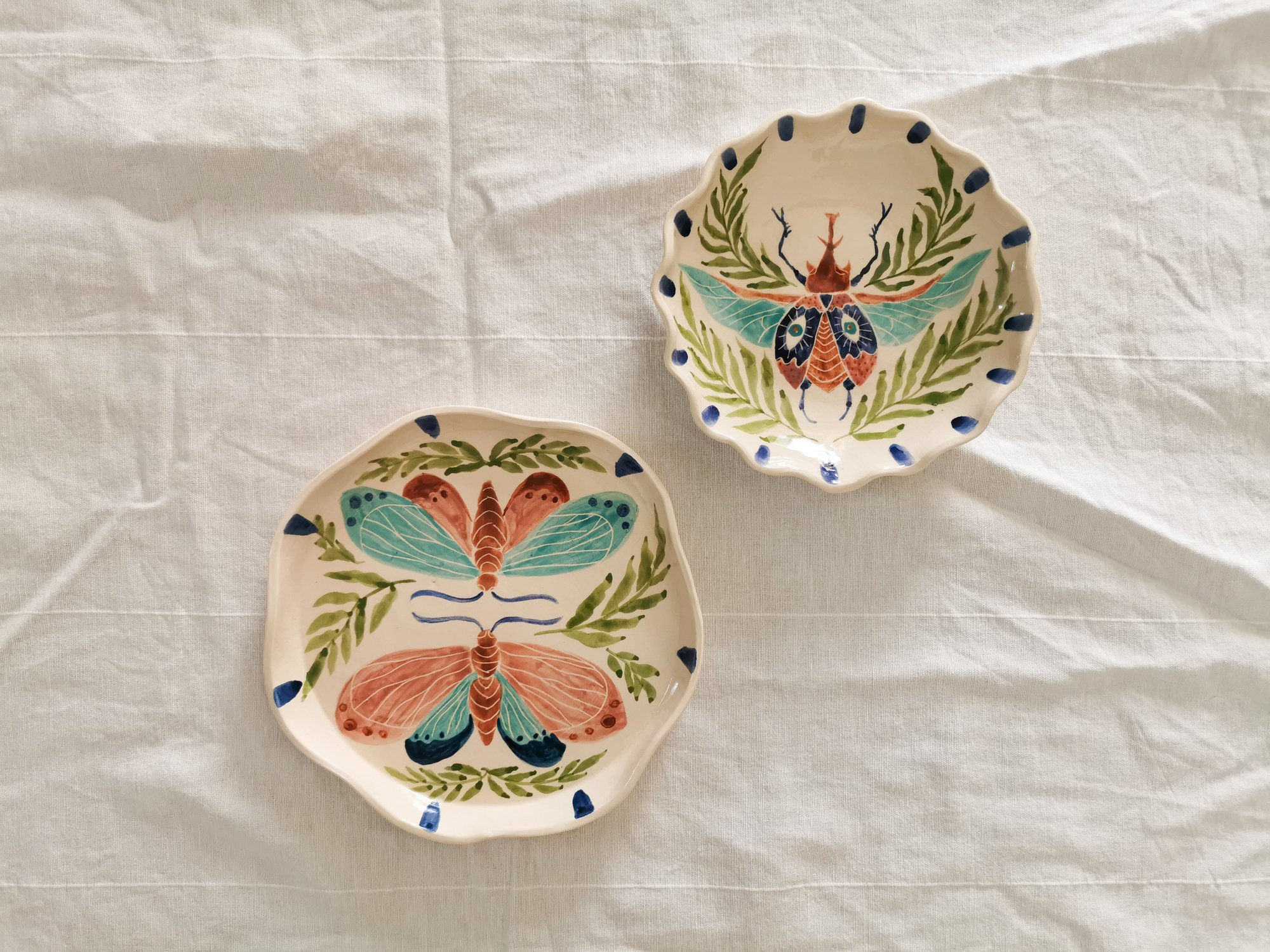 Set de plato hondo y plato llano infantil (o no) de cerámica hecho a mano y pintado a mano con ilustraciones de insectos y vegetales. Cerámica resistente Semigres con esmalte libre de plomo, apto para comida, se puede meter en lavabajillas.